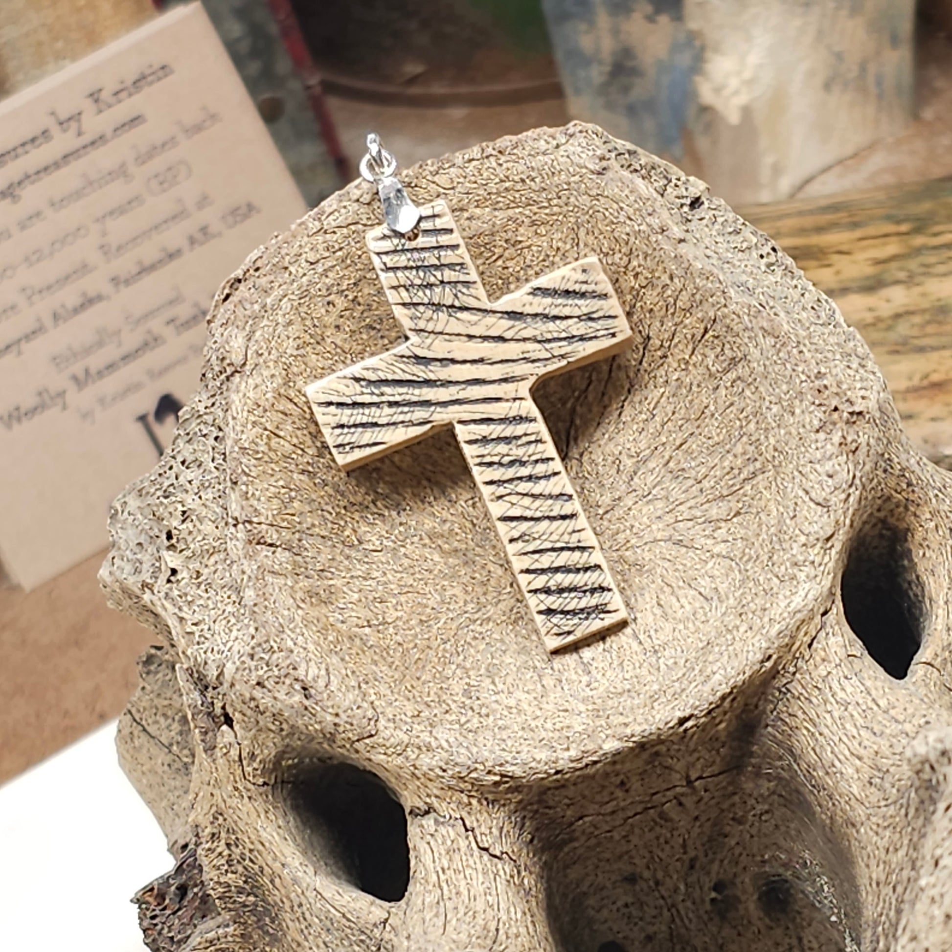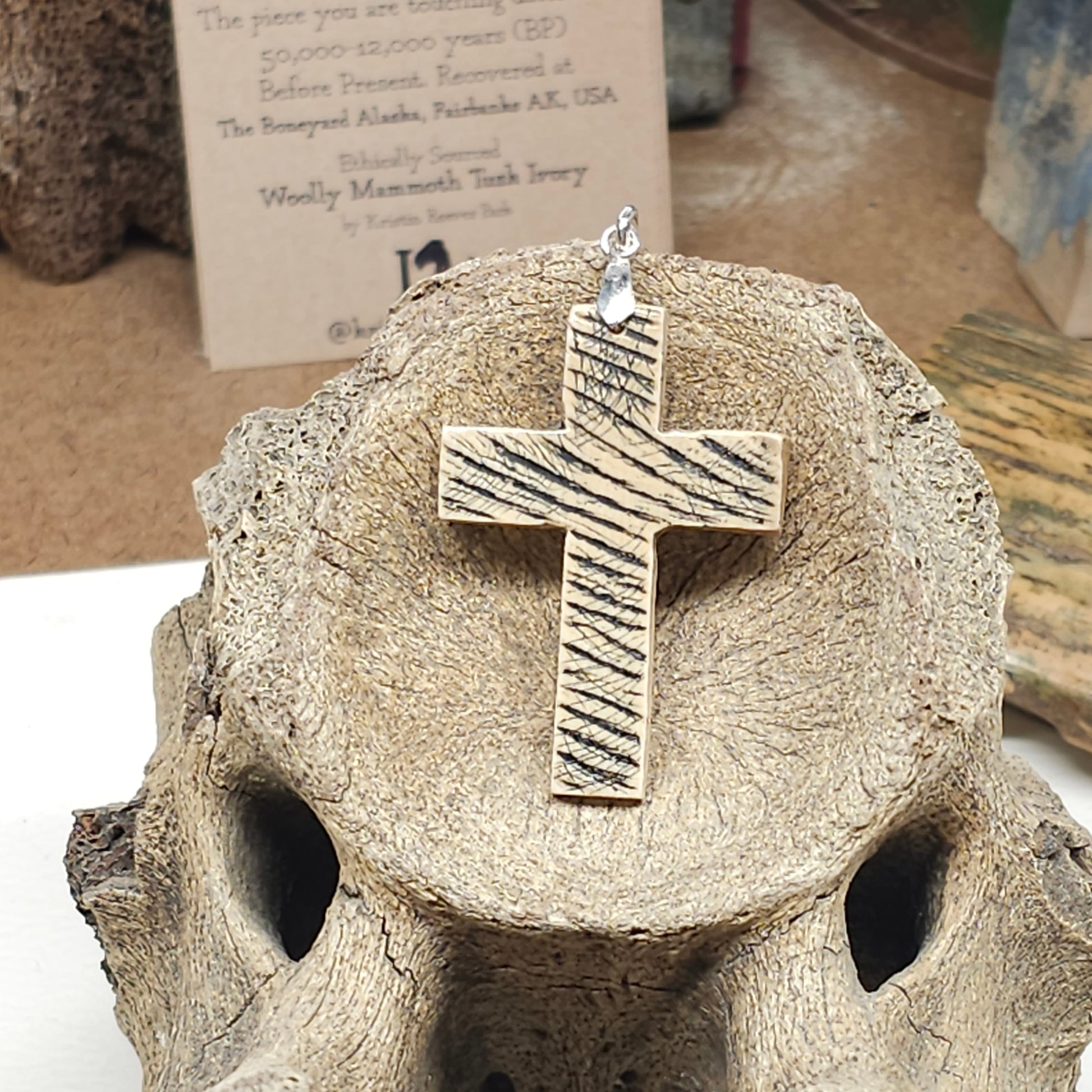 Marked and inked Christian Cross pendant made with Woolly Mammoth ivory discovered at The Boneyard Alaska. I made this out of a tusk piece recovered at the Boneyard Alaska. A rare artifact handled by only a select few "Master Boners" during discovery and stabilization. Sterling .925 bale. Makes a perfect gift!