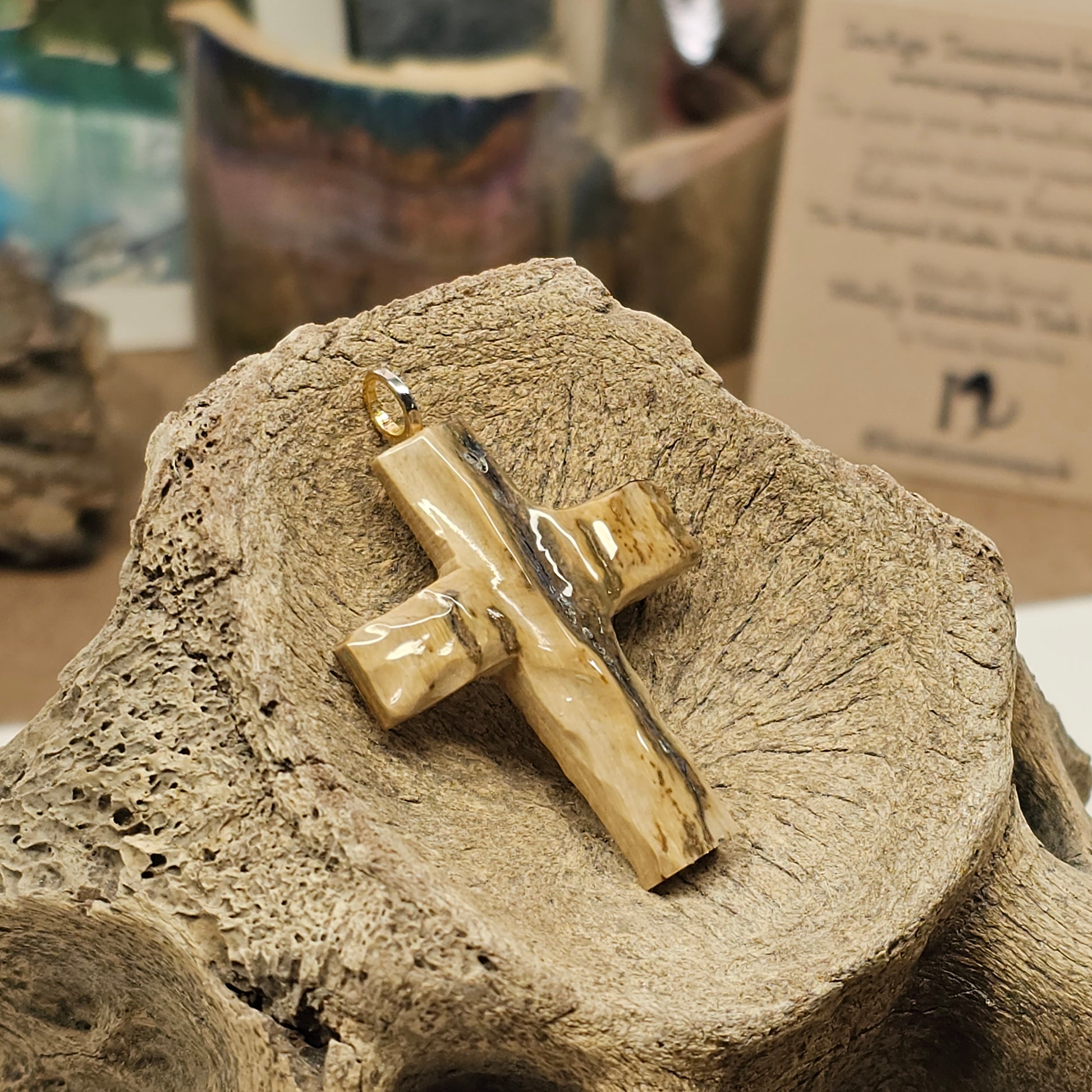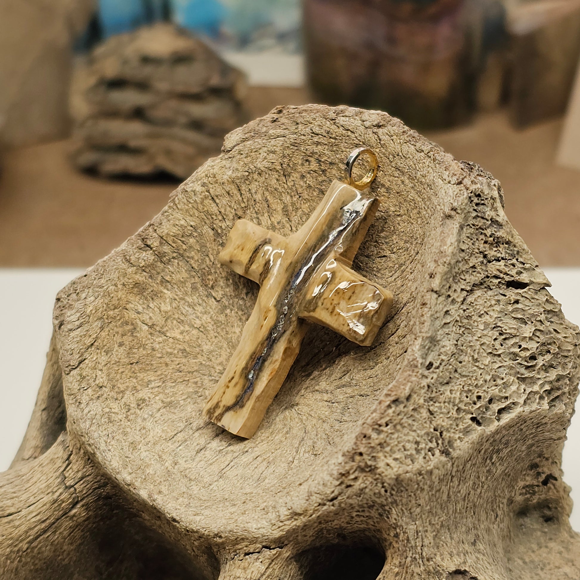 Carved Christian Cross pendant made with Woolly Mammoth ivory discovered at The Boneyard Alaska. I made this out of a tusk sherd recovered at the Boneyard Alaska. Beautiful tones of mineralization and colors. Add to your jewelry collection with rare Mammoth Ivory that has been frozen in the permafrost at the Boneyard Alaska since the last Ice Age. You are most likely the one of a few humans at most that will have ever touched it! Makes a perfect gift!