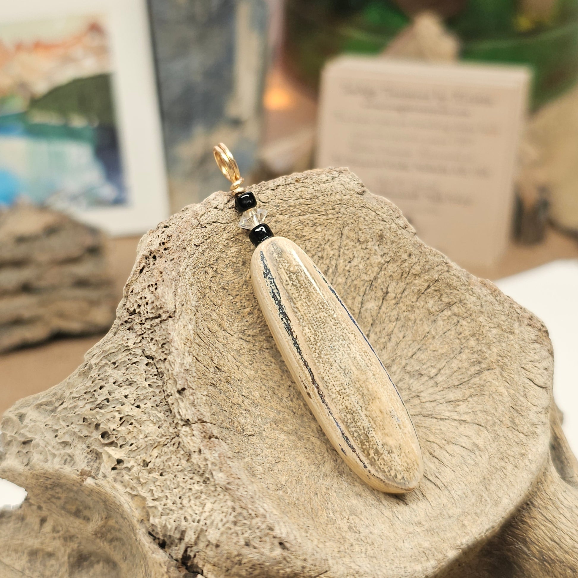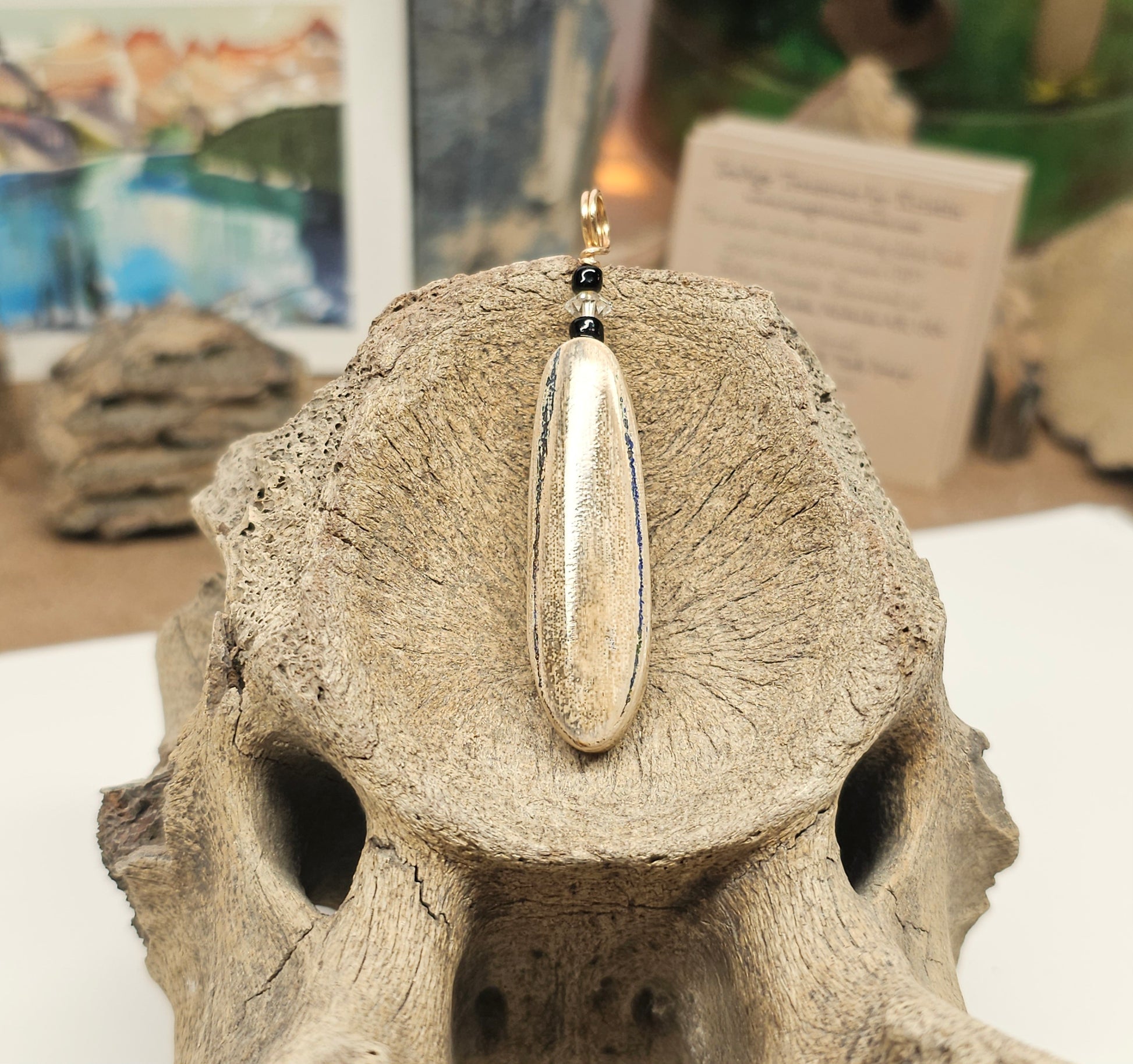 Boneyard Alaska Woolly Mammoth Ivory Freeform Pendant—made with woolly mammoth tusk fragments recovered at the Boneyard Alaska. This piece is shaped freehand capturing the raw and beautiful colors of ancient ivory and making it into a wearable connection to prehistory. Each color tells a geological story—hues drawn from the minerals that cradled this ivory through millennia of permafrost.