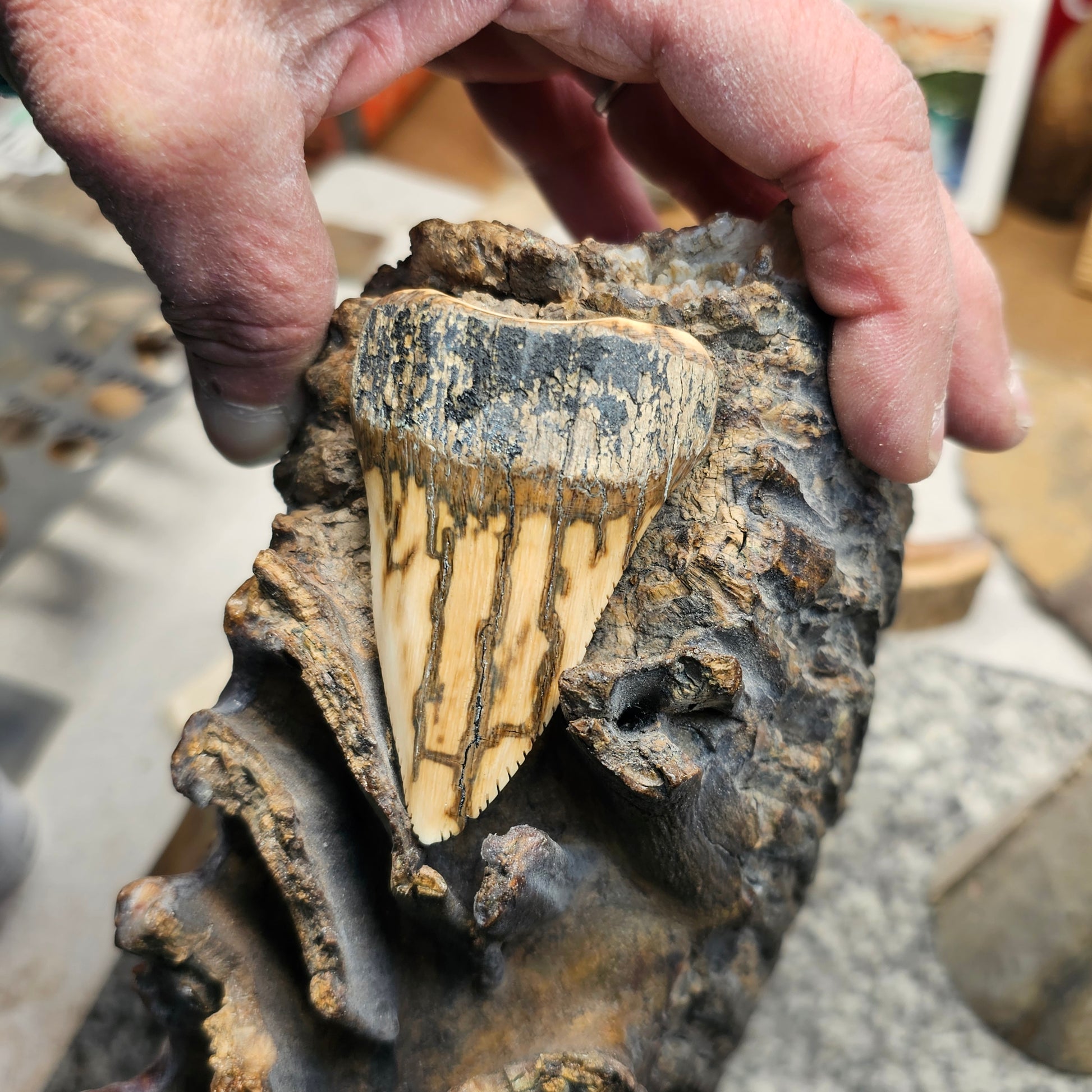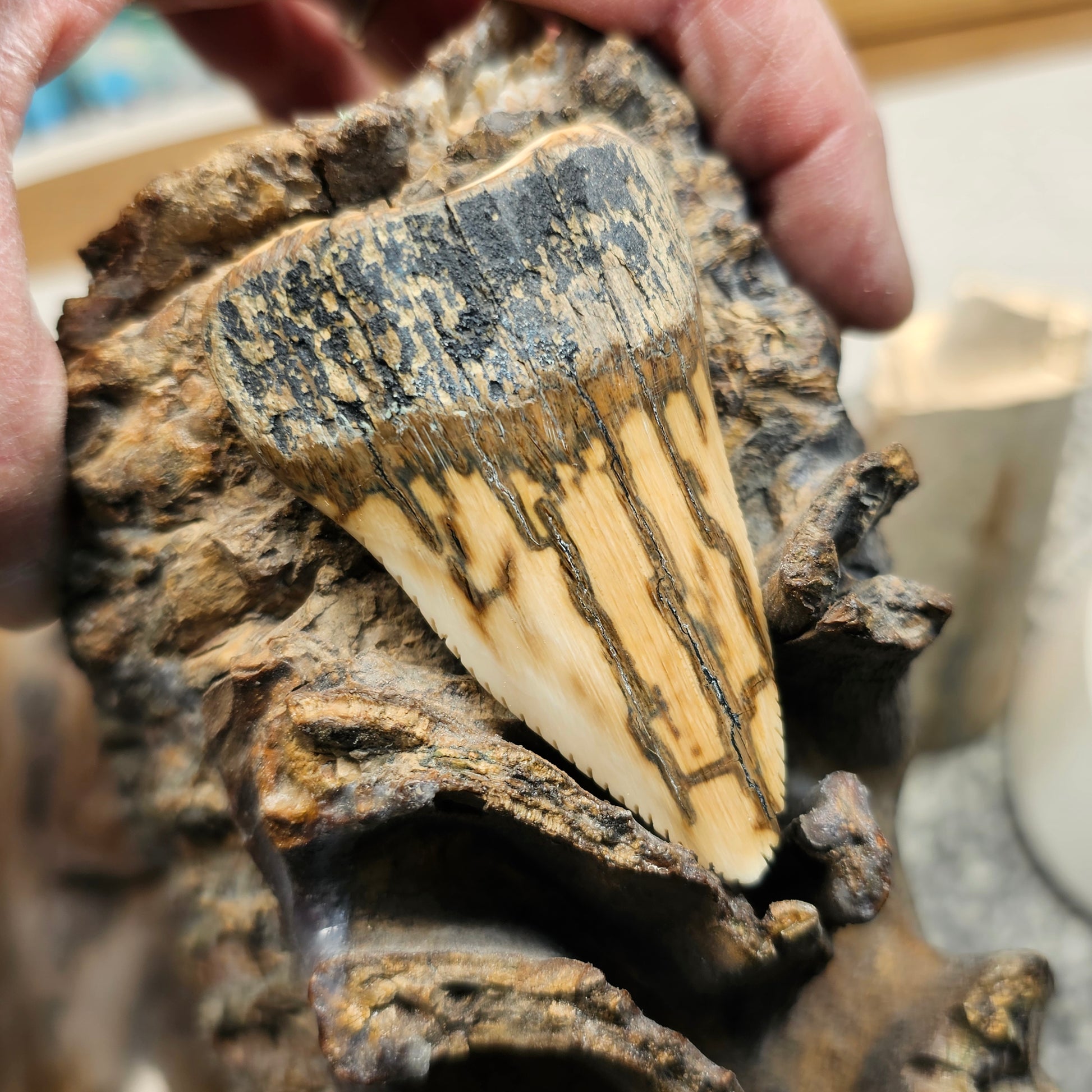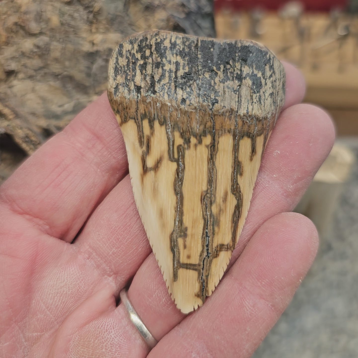 This is an ultra rare and unique piece and ready for a discerning collector. High character and mineralization offering beautiful colors and natural tusk bark maintained at the notches and shoulders of the tooth where is shows the black carbon crystals. Each tooth is hand cut and finished by me, Kristin Reeves Park. Perfect for your personal shark tooth fossil collection.