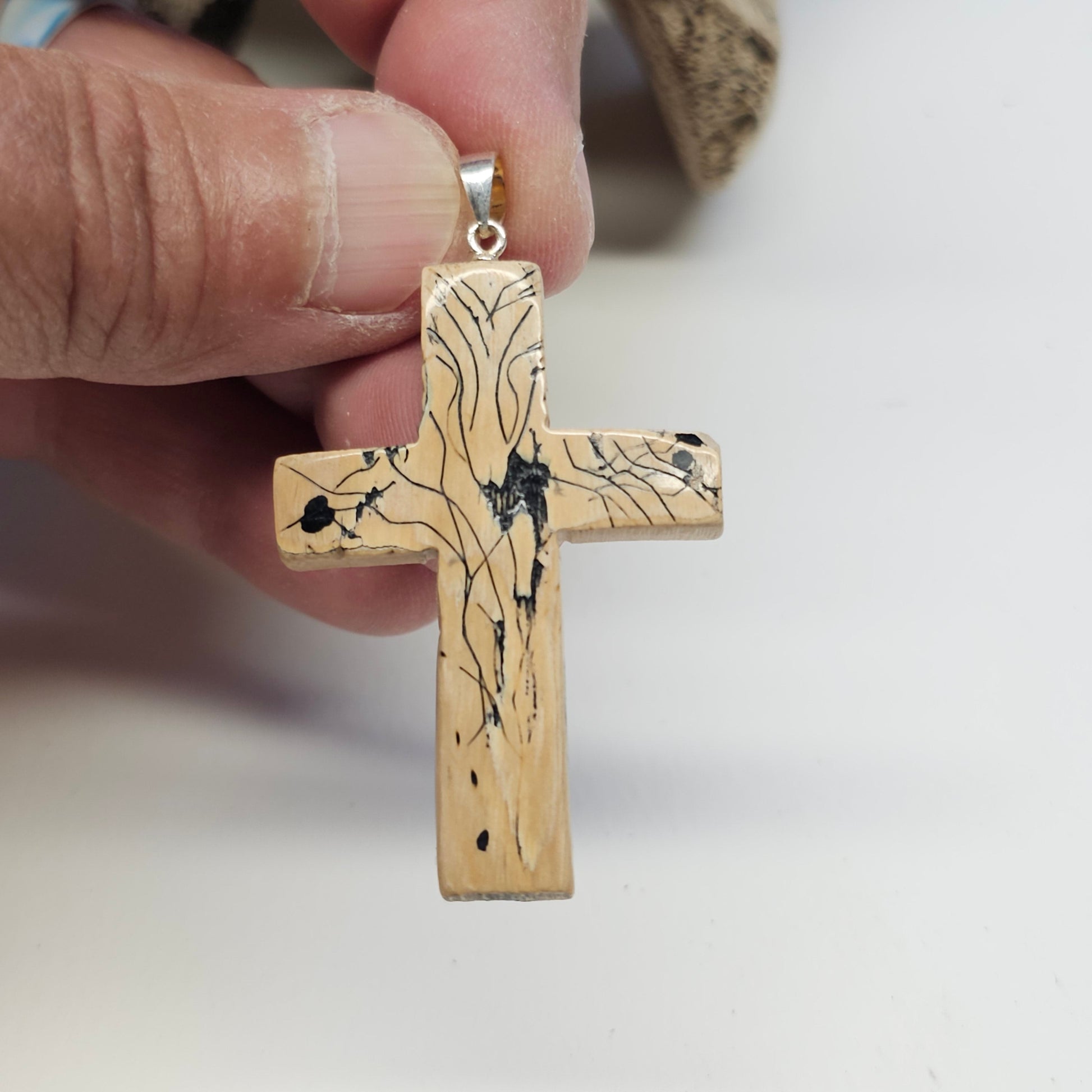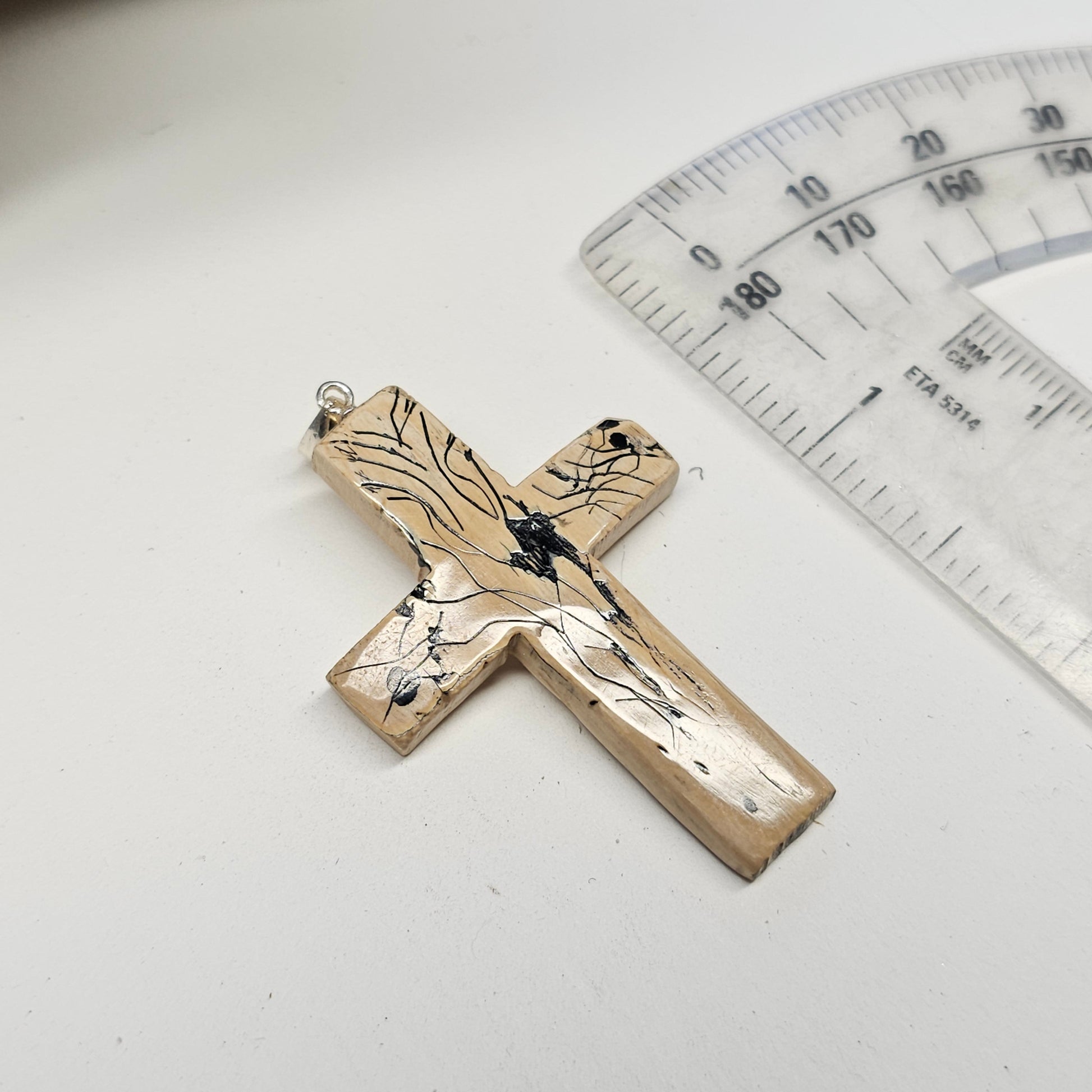 Christian Cross pendant made with Woolly Mammoth ivory discovered at The Boneyard Alaska. Unique Ice Age treasure. I made this out of a small broken and irreparable tusk piece recovered at "The Boneyard Alaska". I lightly hand scribed the design and finished it with black India ink. Sterling Silver hardware. Made in the USA