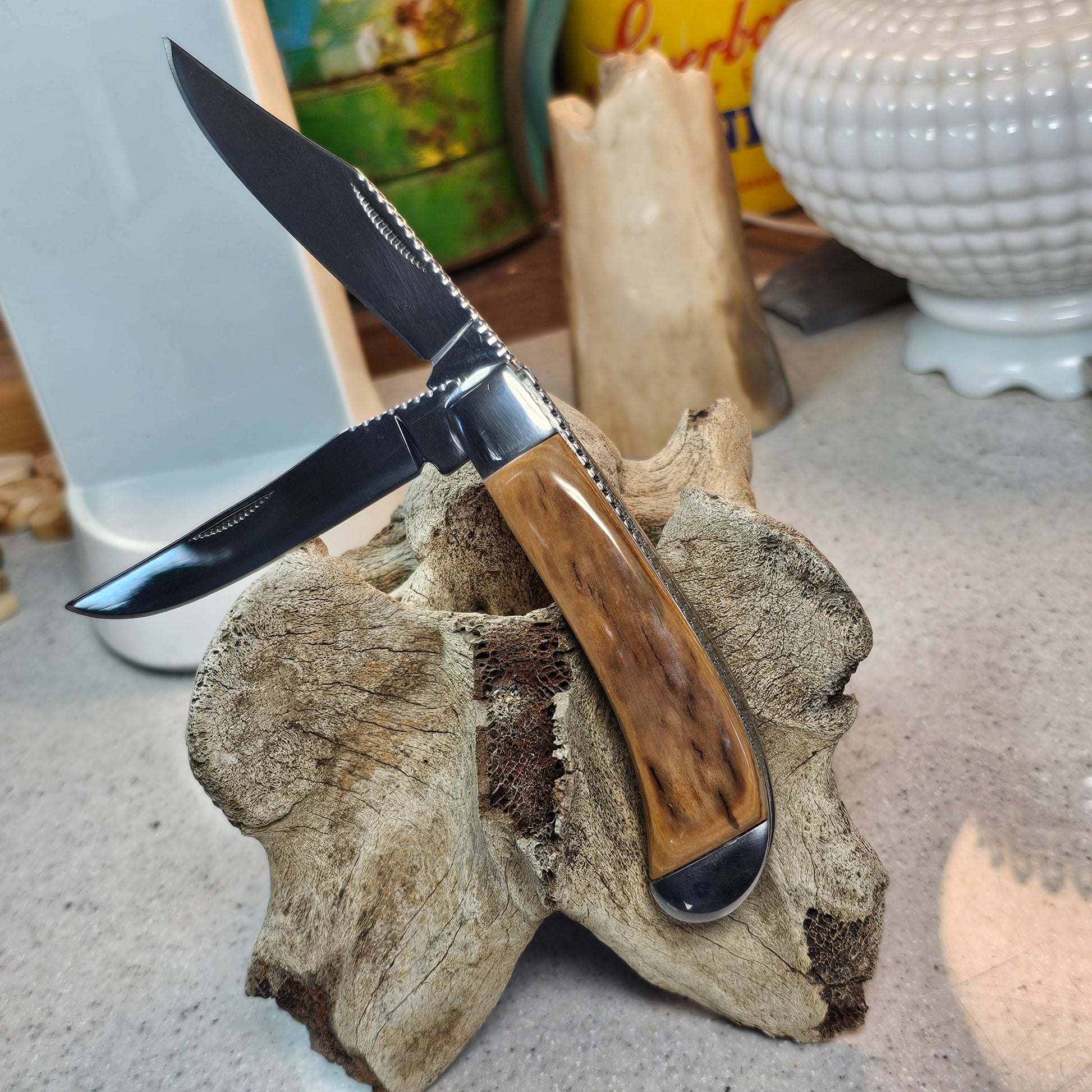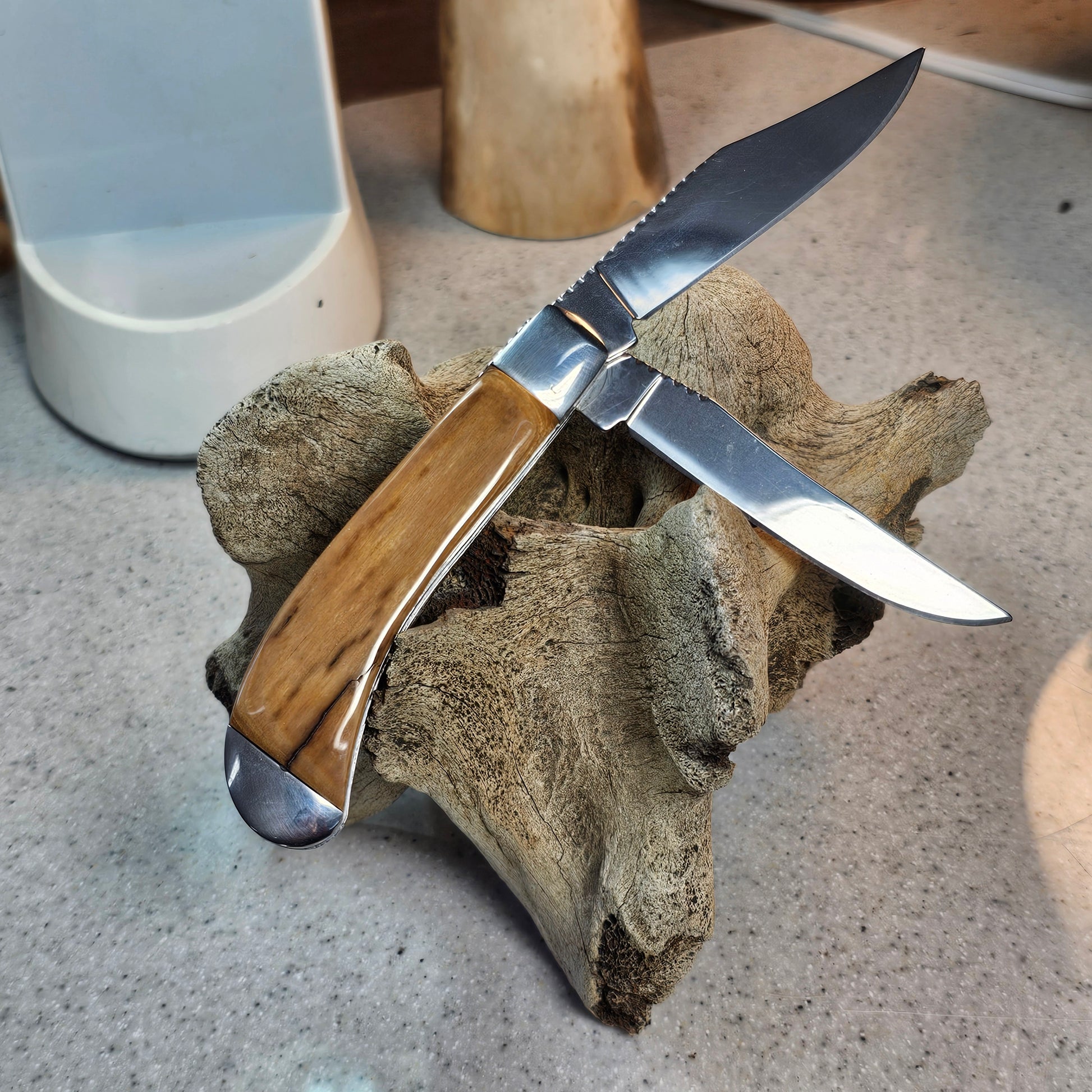 Boneyard Alaska Woolly Mammoth Ivory grip pocket knife. Remarkable mineralization in browns and carmel colors with quality ivory characteristics. The "Trapper" dual blade folding pocket knife with beautiful mineralization colors maintained throughout start to finish. Feels good in the hand and perfect for collectors. Stainless steel premium blade. Proudly hand created with Woolly Mammoth Fossil Ivory found and recovered at the Boneyard Alaska.