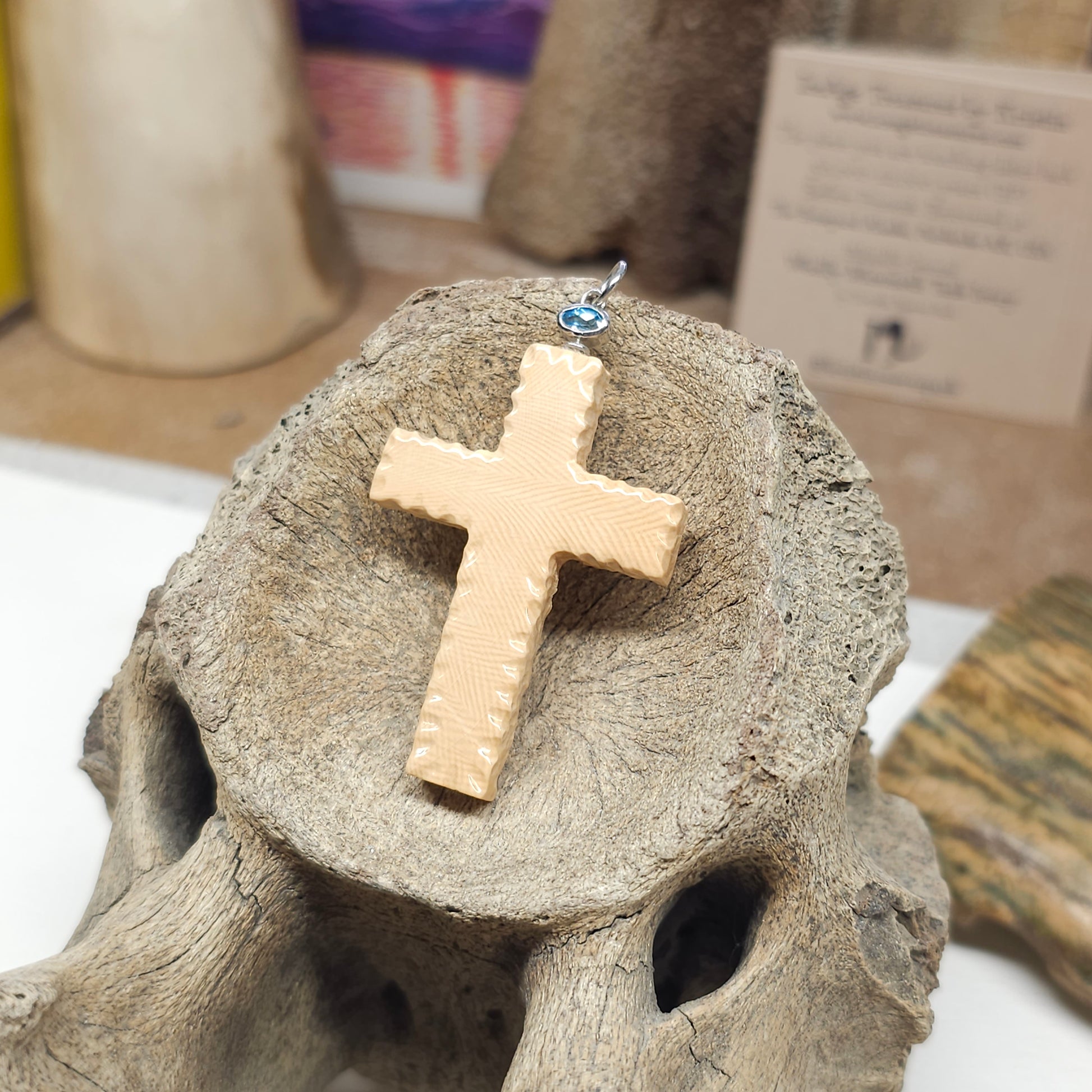 Boneyard Alaska Woolly Mammoth Ivory Carved Christian Cross with Glacier Blue Bale