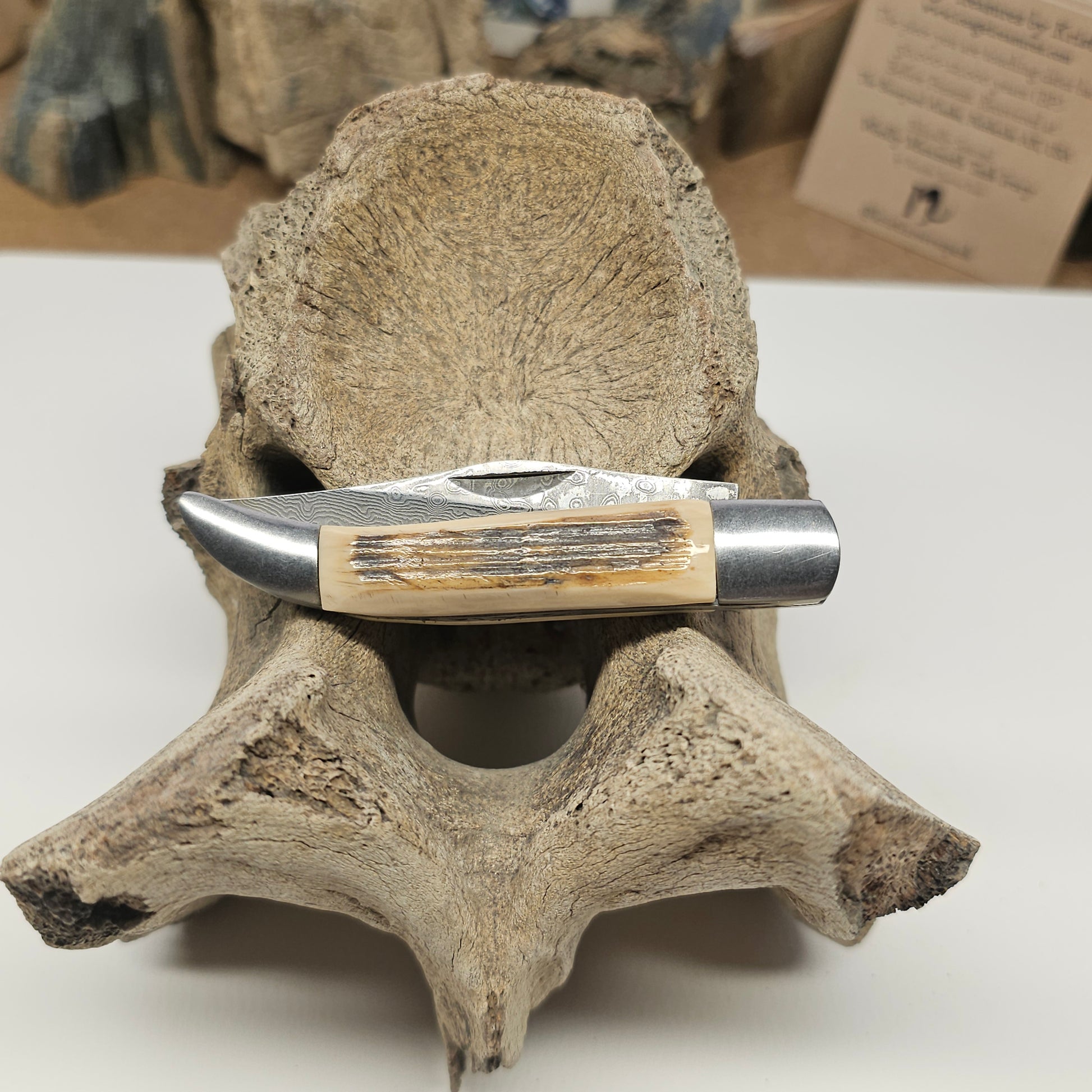 Damascus blade paired with brushed stainless steel hardware. Each piece is individually finished to protect fragile details that power sanding typically destroys. A distinctive collectible for those who value fossil provenance, material integrity, and craftsmanship that honors the ancient ivory's inherent story.